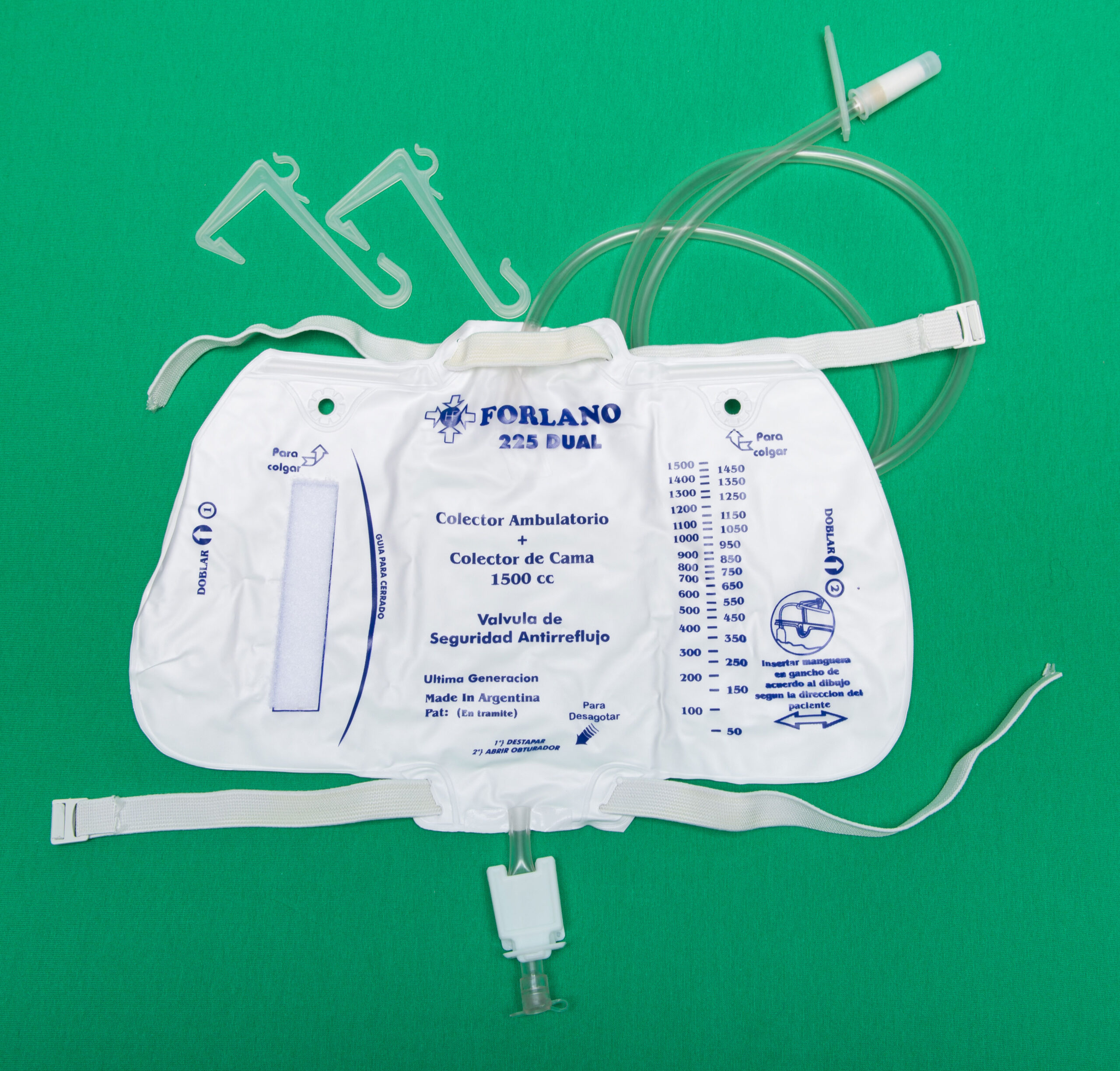 Colector de orina para uso diurno-nocturno, capacidad 1 500 ml, PVC, con correderas ajustables para uso ambulatorio y toma de muestras.